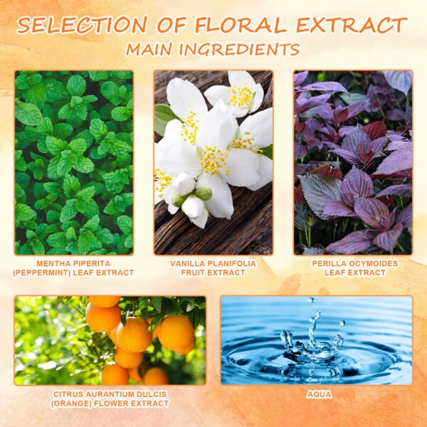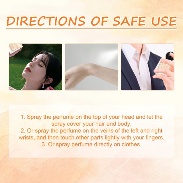 Our Dopamine Perfume contains Mentha Piperita (Peppermint)Leaf Extract, Citrus Aurantium Dulcis (Orange)Flower Extract, Vanilla Planifolia Fruit Extract. It can improve the surrounding atmosphere, create a more pleasant and comfortable environment, and enhance your personal charm. It’s easy to apply: spray the perfume on top of your head and let the spray cover your hair and body, spray the perfume on your left and right wrists, then gently apply the rest with your fingers, or spray the perfume directly onto your clothes. It can boost an individual’s self-confidence and help to project a more positive and confident image.